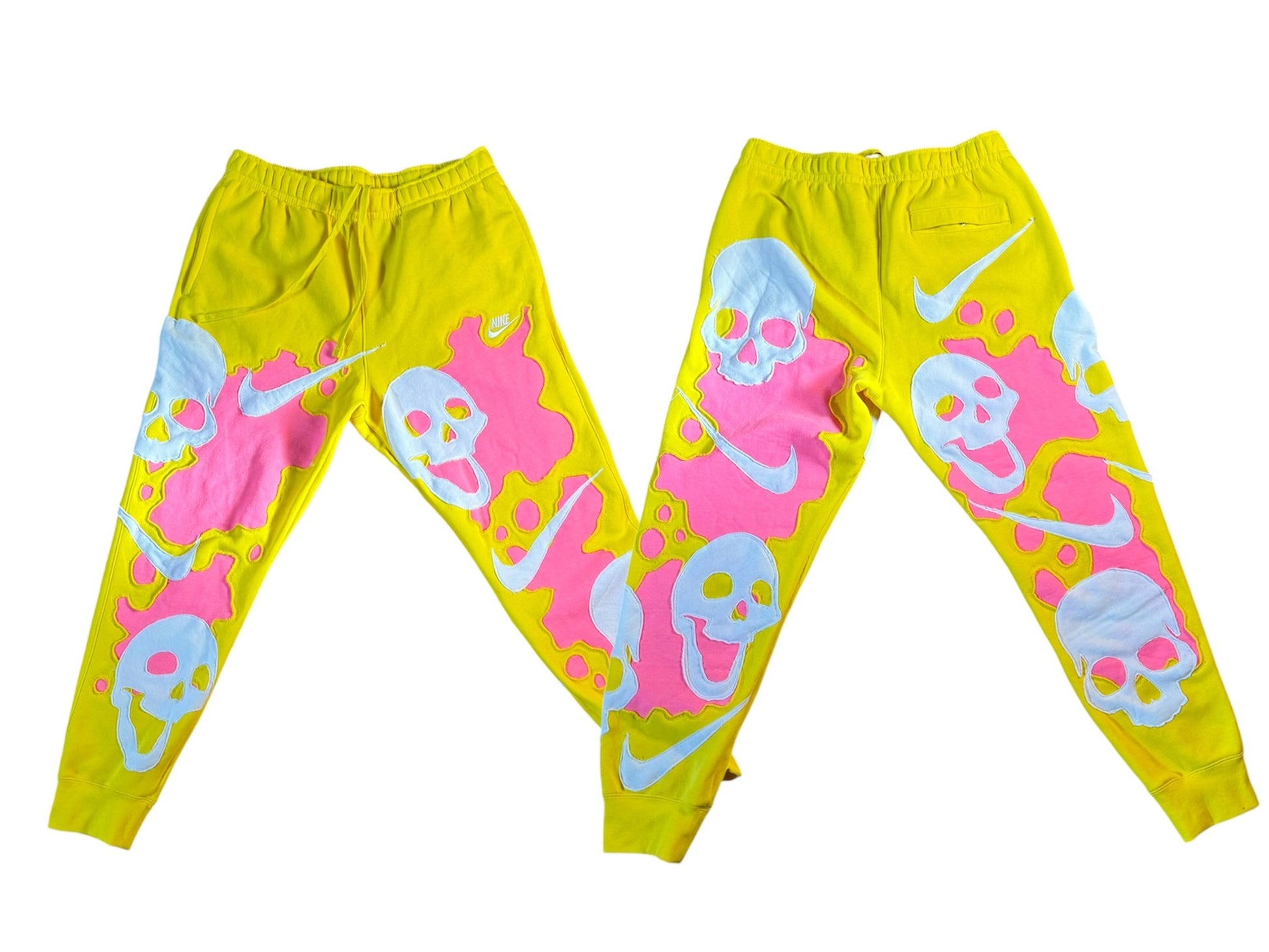 Go bold with Sunset: Nike X Reworked. These Nike sweatpants feature unique white cutout skulls and a neon pink background under the iconic swoosh. Perfect for a sunset workout or a casual day out. Get ready to turn heads and break away from the ordinary.