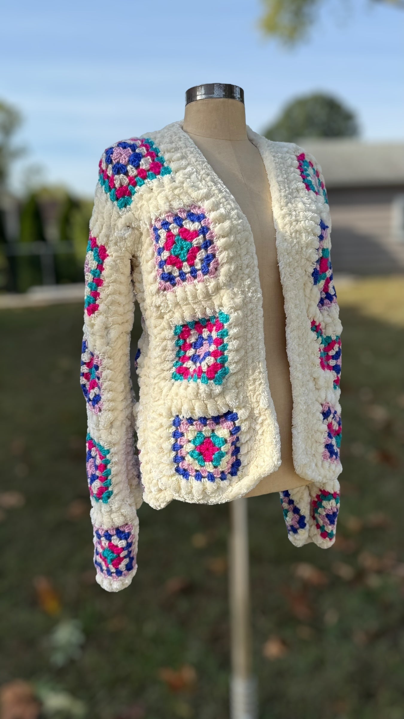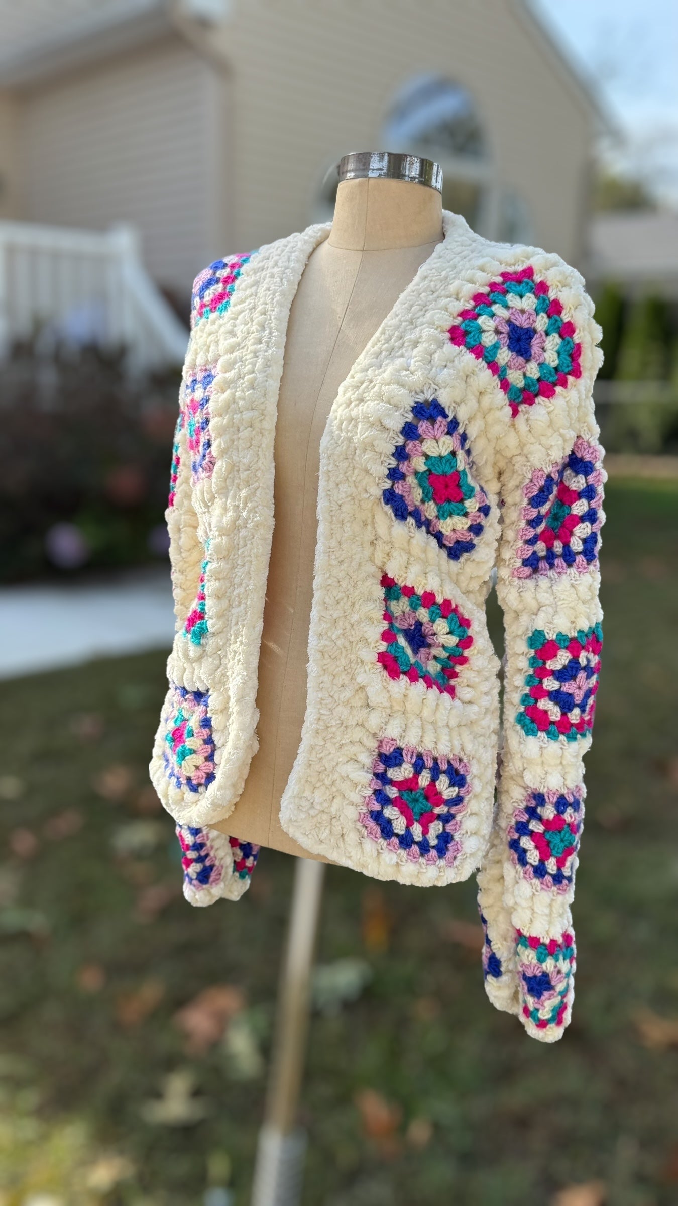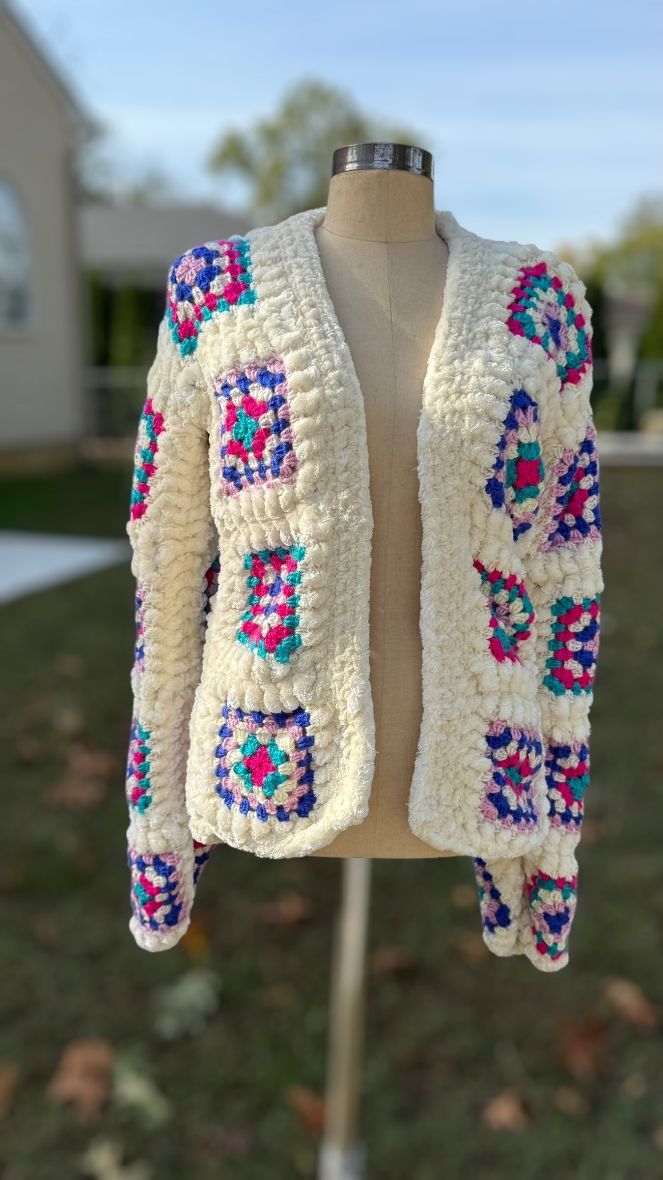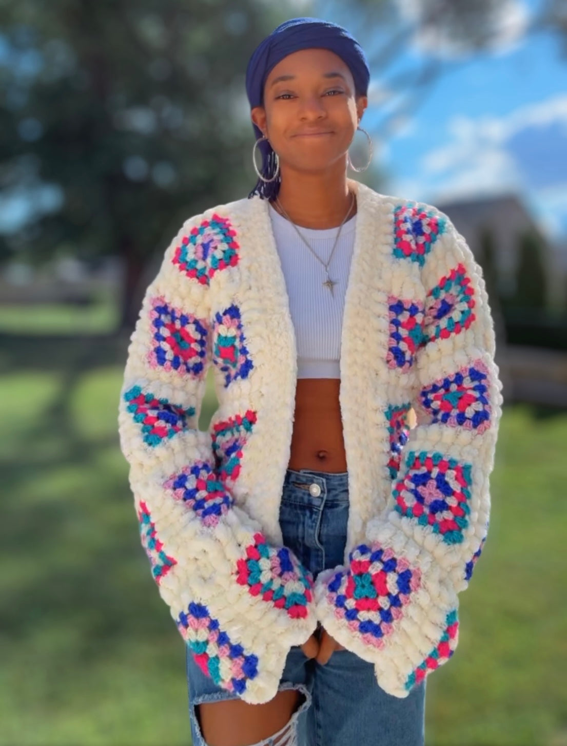 Introducing the Santorini Snug - a cozy cardigan that combines handmade crochet with the vibrant colors of a Mediterranean city. But don't let its style fool you, this cardigan also provides the perfect amount of snugness.