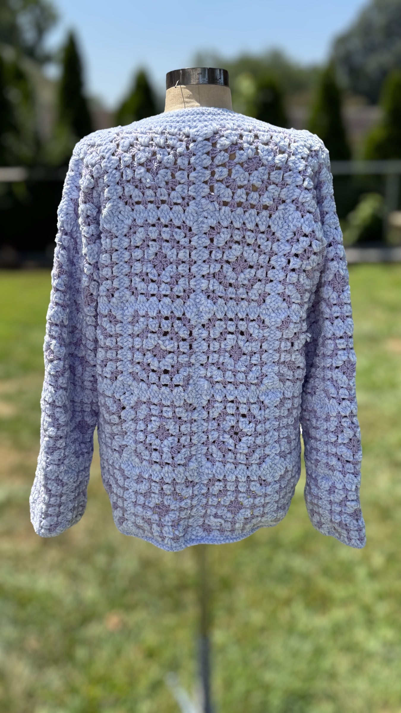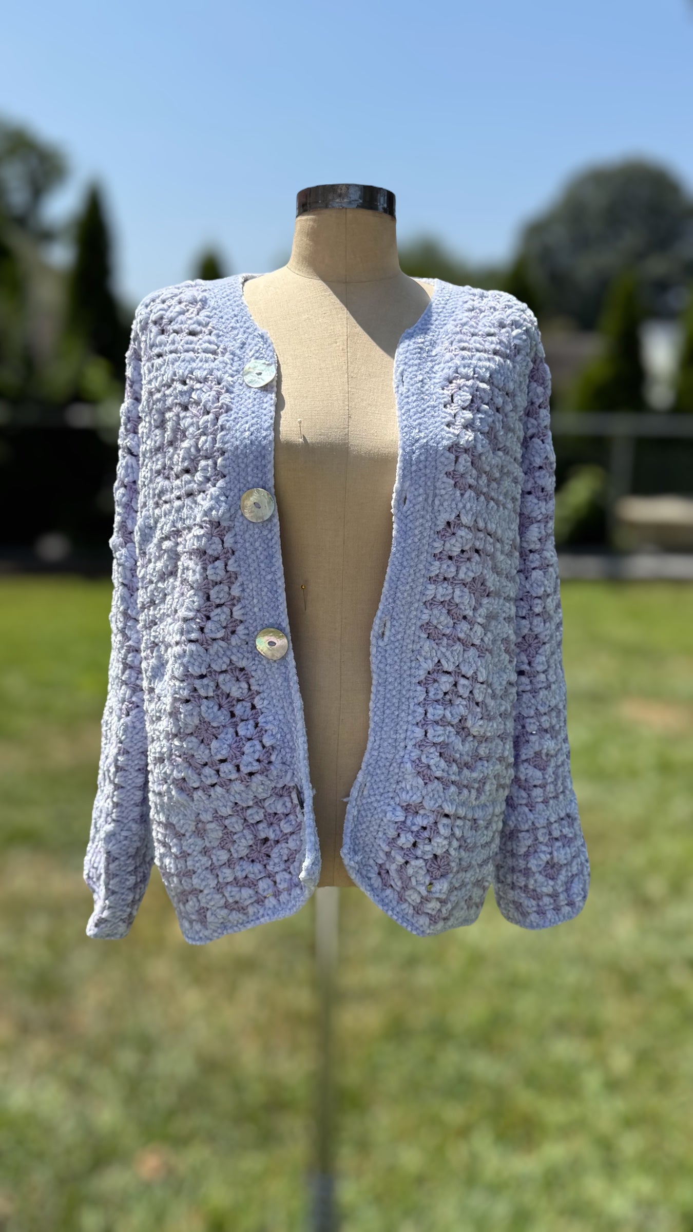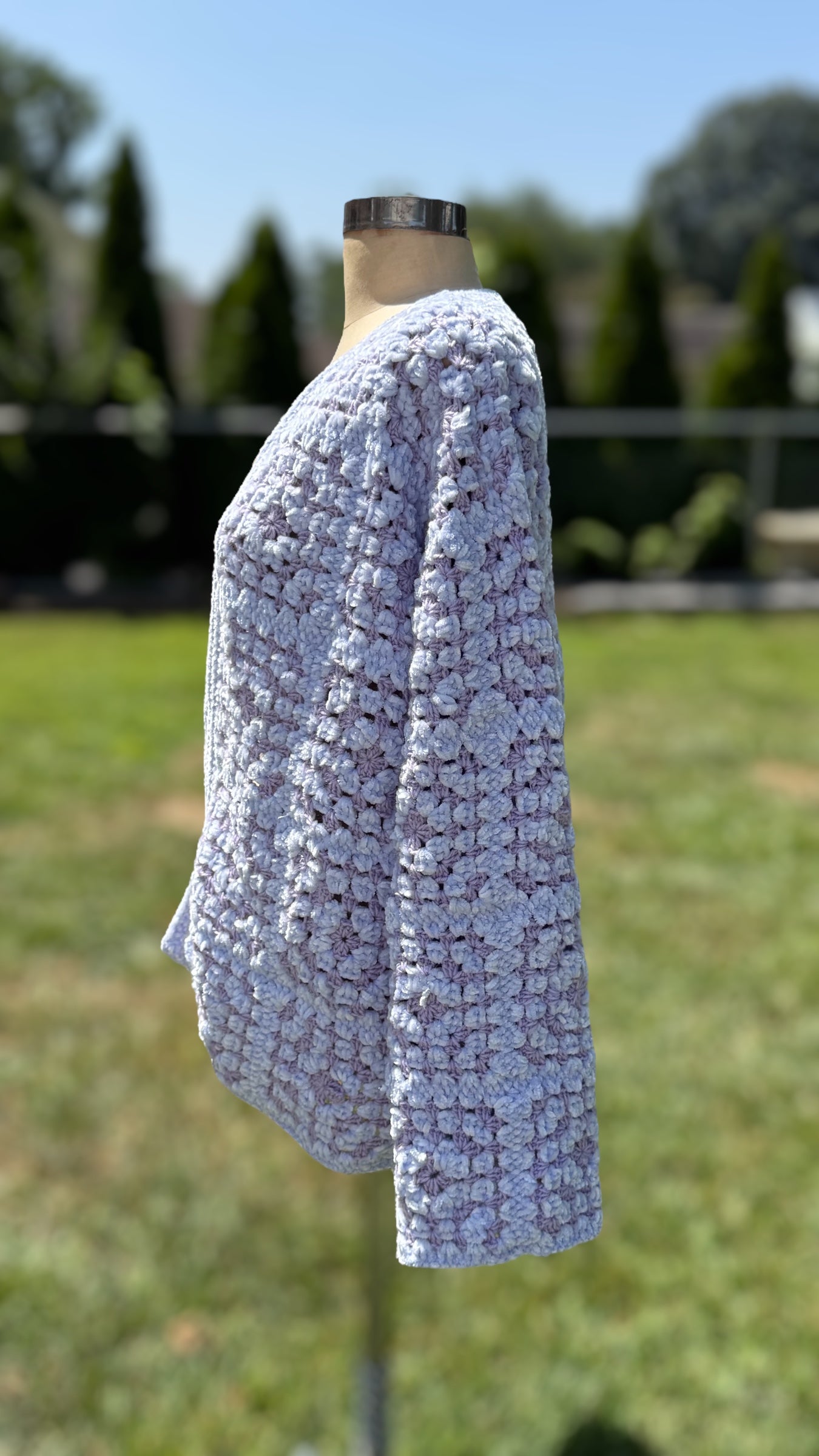 Wrap yourself in the soft, luxurious comfort of the Lavender Velvet cardigan. Hand-crocheted with a blend of cotton and baby yarn, this cozy cardigan will keep you warm and snug. Perfect for snuggling up with a good book or enjoying a crisp evening.